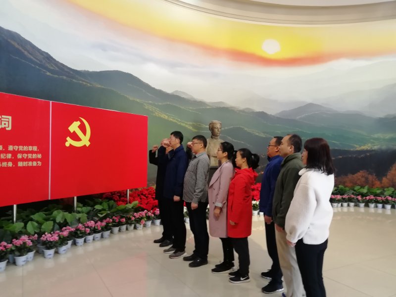 参观时,组织了对党旗宣誓活动。在党总支书记带领下,8位党员同志右手举拳对党旗宣誓。参观结束后,大家与高君宇纪念馆门前广场上的高君宇雕塑合影留念。